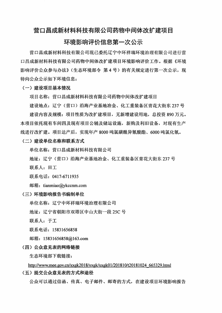 營(yíng)口昌成新材料科技有限公司藥物中間體改擴(kuò)建項(xiàng)目環(huán)境影響評(píng)價(jià)信息第一次公示